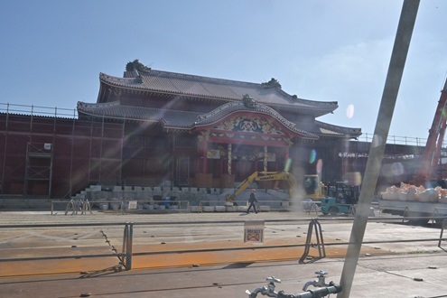 ▼復元中の正殿を見下ろす東のアザナにて.j