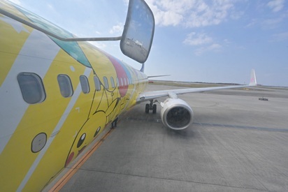 ▼那覇空港からはピカチューのラッピングが施された飛行機に乗る